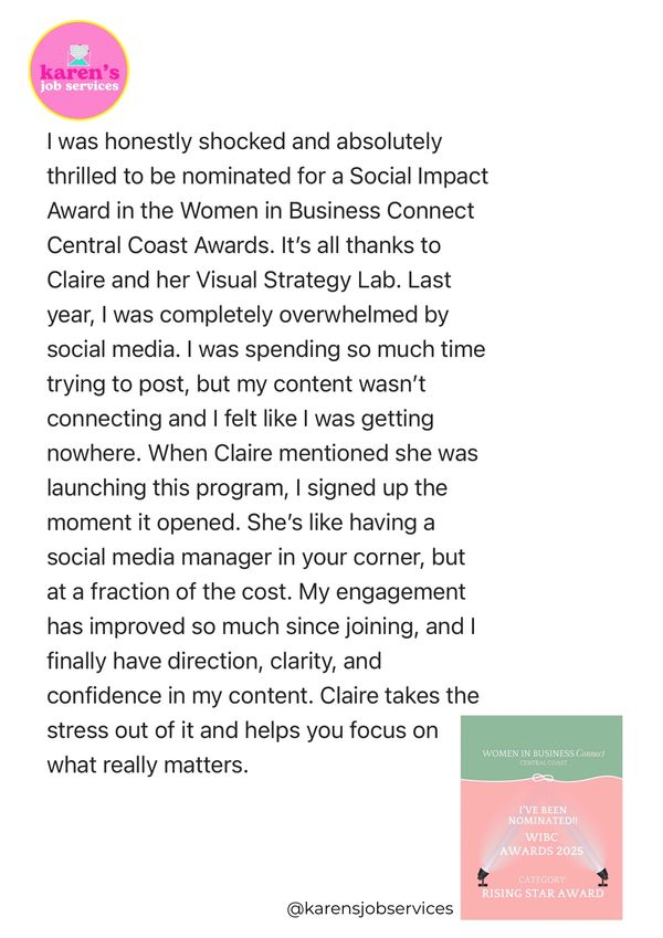 I’ve used Claire to do two brand identities - the latest being just this last month for my relaunch - a photoshoot and now as a member of Visual Strategy Lab where she designs my socials. My branding is on point and the process on both occasions was painless. Claire will really try to get the heart or you and your brand, and deliver great design options to fine tune. It was so helpful to also have her do my first photoshoot in ages. I am hugely camera shy but her personality makes you feel so comfortable. You just have to rock up on the day and her makeup/ hair artist does the magic before your shoot. Again…. Painless. I have photos now which make me look better than I have in forever, which gives me confidence to put myself out there. So of course my trust in Claire and her ability to make me and my brand look great led me to join her new Visual Strategy Lab. This is my first month and I got a beautiful set of socials that will transform my grid. Took the captions that came with, tweaked them a bit and 12 beautiful posts all done ! Saved me hours of torture. So again…. Painless. This is going to save me so much time every month. I highly recommend Claire if you’re a small business or need personal branding of any kind. Plus she is a top human too, which makes working with her an easy choice.